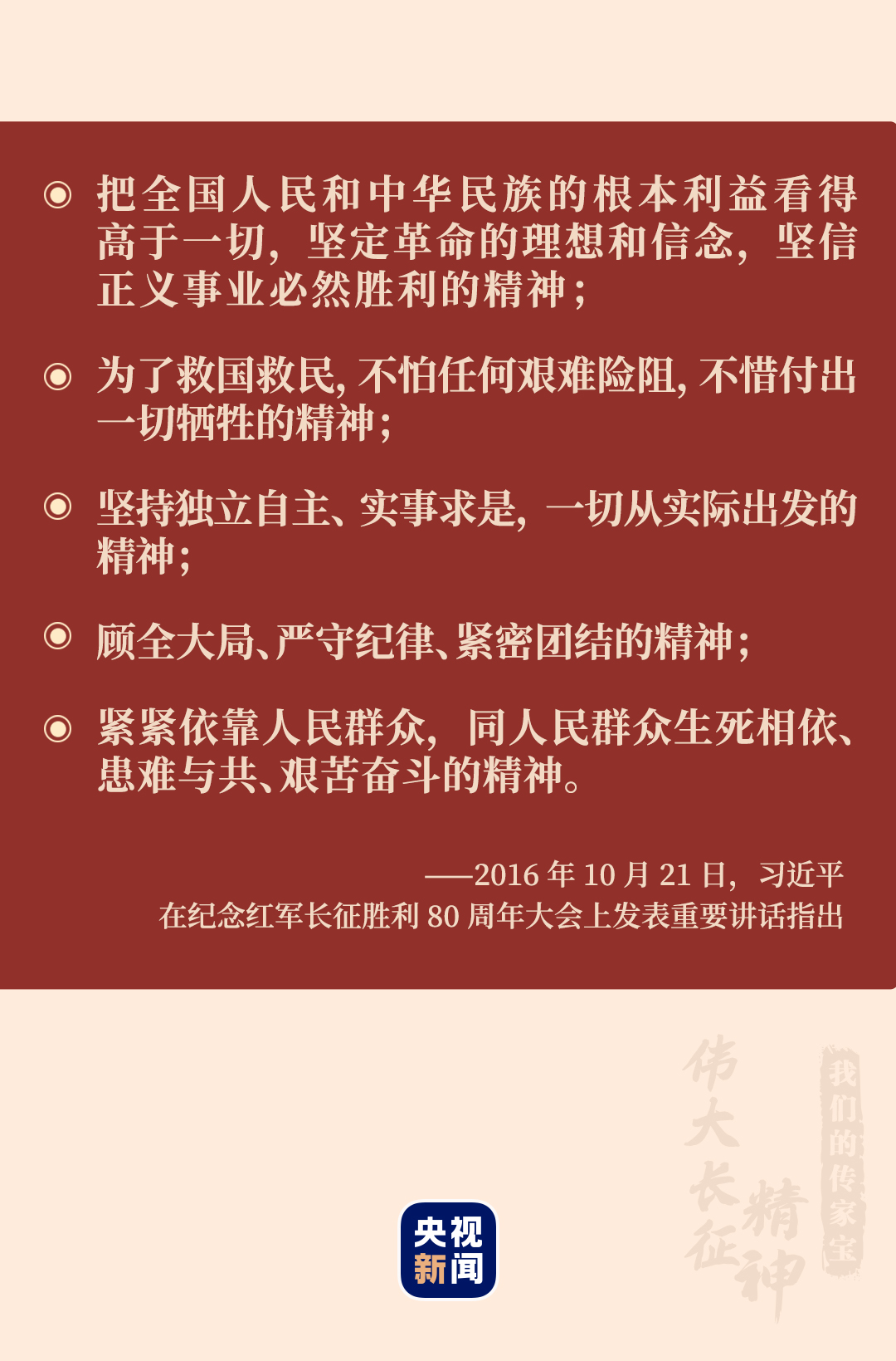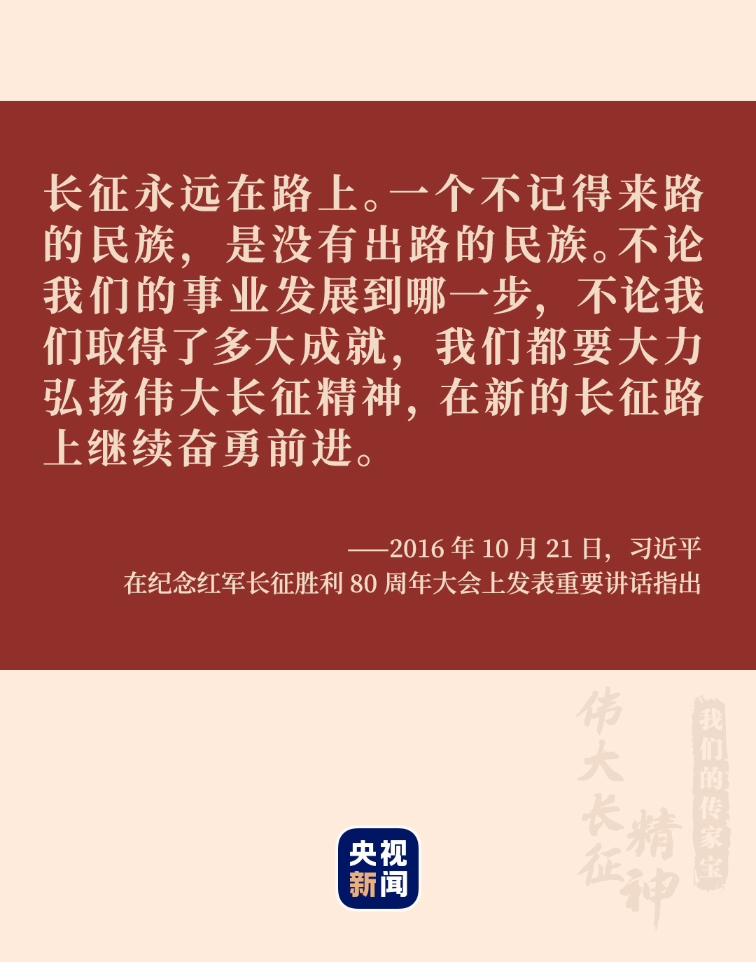 2016年10月21日,在紀(jì)念紅軍長征勝利80周年大會上的講話中,習(xí)近平總書記指出:“長征的勝利,靠的是紅軍將士壓倒一切敵人而不被任何敵人所壓倒、征服一切困難而不被任何困難所征服的英雄氣概和革命精神。”